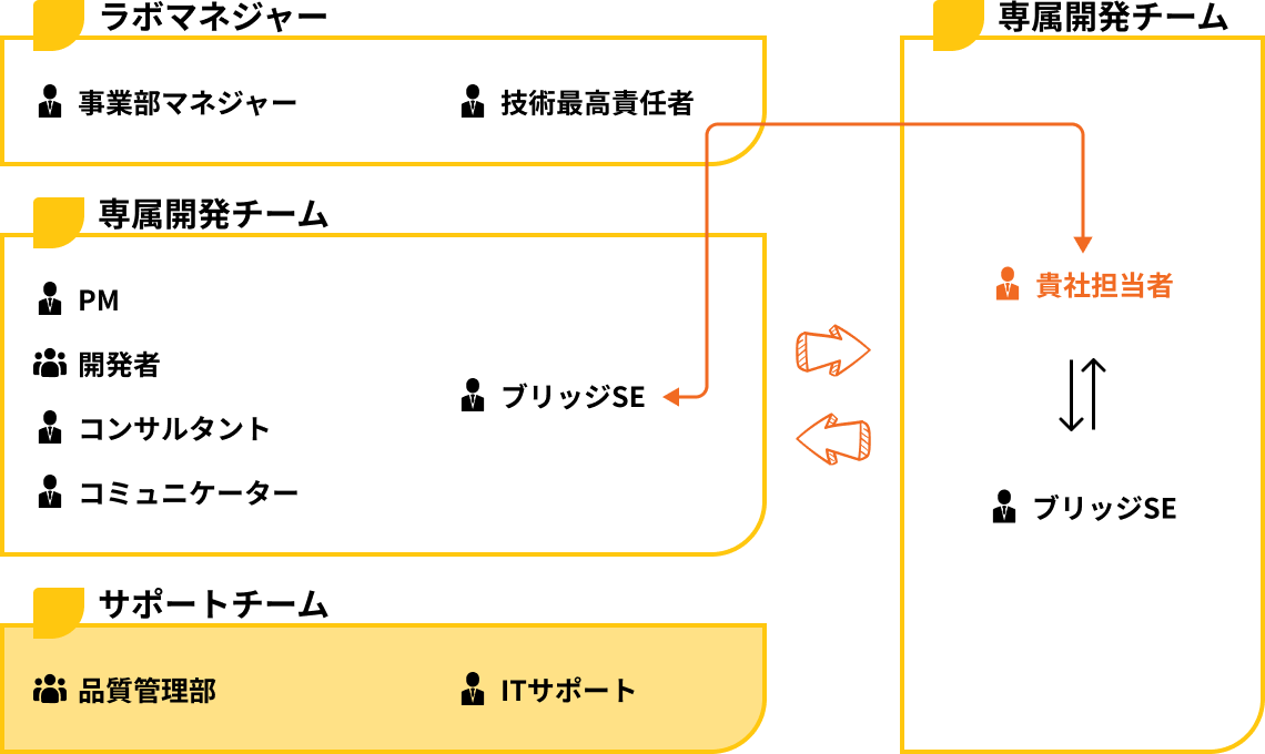 AIラボ型オフショア開発で、必要なスキルを持ったエンジニアを、必要な人数、必要な期間、 貴社専属の開発チームを弊社内に持って開発していきます。