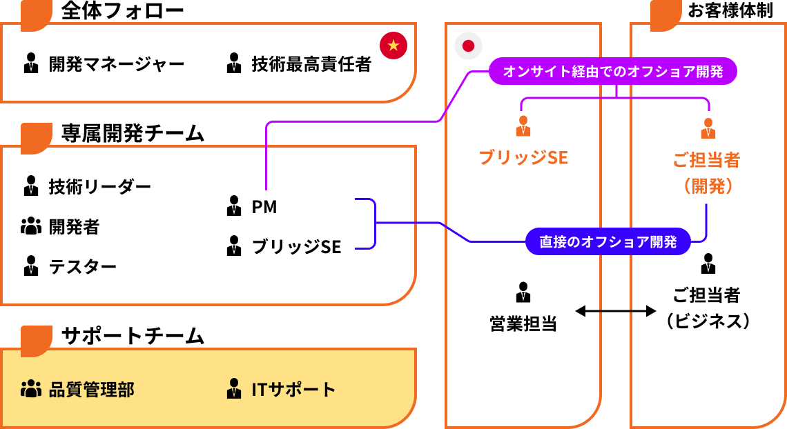 - 貴社専属チームのブリッジSEが日本の現場に合流する形態も可能です(オンサイト)